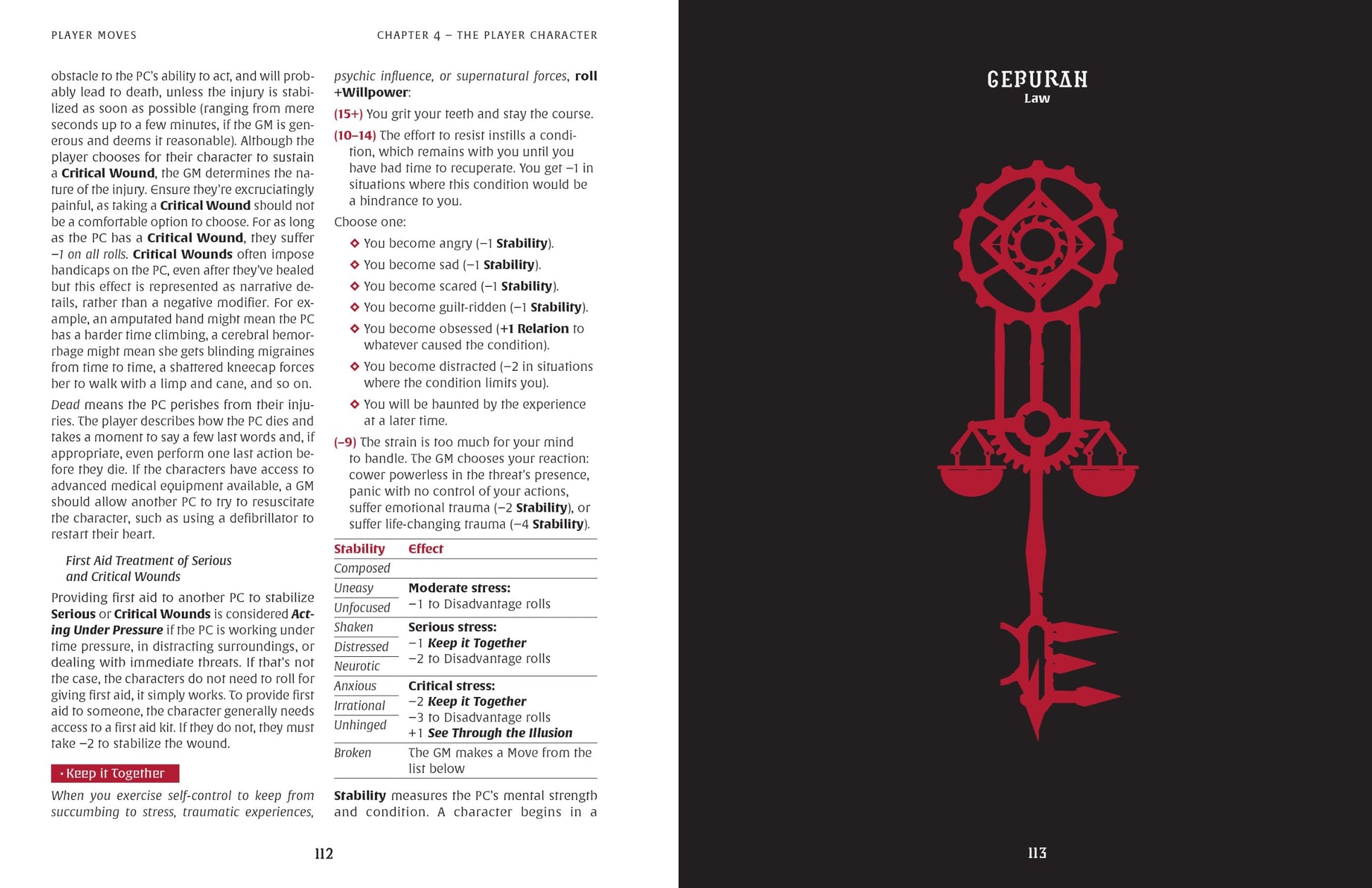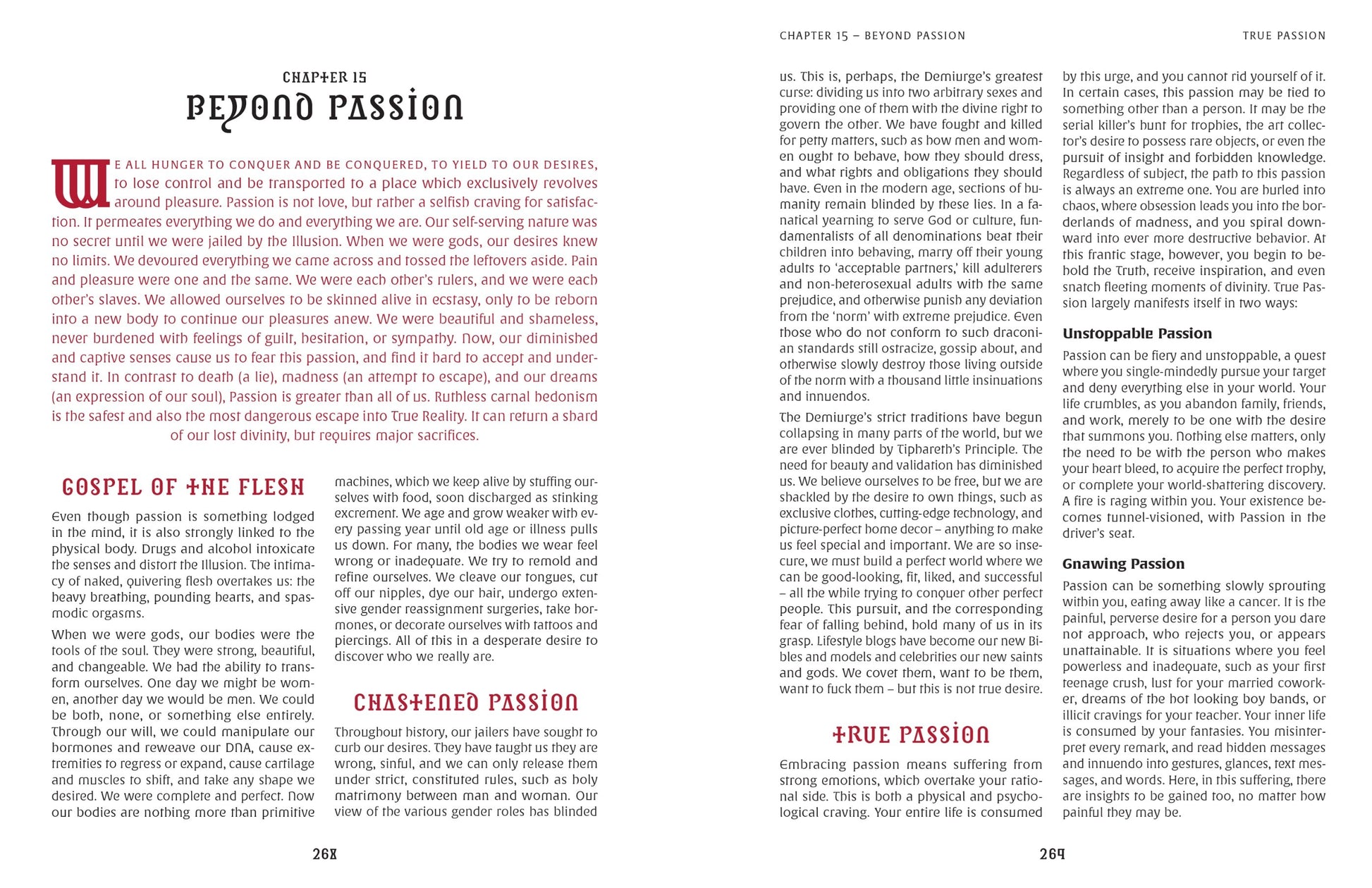 The Bible Edition (2nd version) is a “pocket version” of the KULT: Divinity Lost Core Rules, in an all-text version. The book is in the same physical format as a typical bible. The 2nd version of the Bible Edition features a black cloth cover, with gold foil print on top, and two color print inside with blood red headlines, making them clearer and more visible than the 1st version of the Bible Edition. Just as with the 1st version, the edges of the pages are gold coloured.