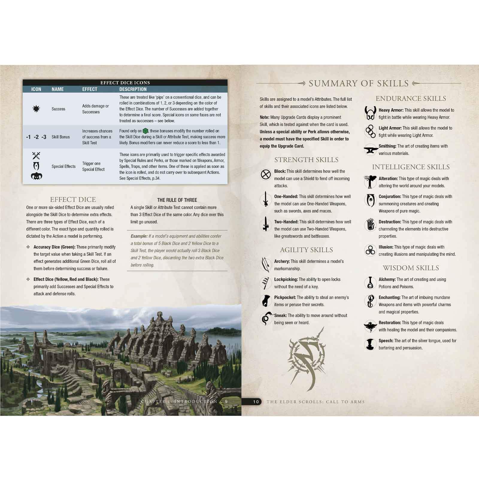 The Elder Scrolls: Call to Arms is a tabletop wargame set against the epic, sprawling backdrop of Tamriel. From the teeming cities of Cyrodiil to the towering mountains of Skyrim, across the ash-plains of Morrowind, and through the steaming swamps of Black Marsh, you must lead your Party of bold warriors on the path to glory. In this game, you must select a mighty champion to lead your Party, surrounding them with heroes and staunch followers. Players can take on quests, unearth magical artifacts, and fight roaming monsters as they do battle against their opponent, using a combination of strength, stealth and magic to win the day. Call to Arms is a simple game to learn, but a challenge to master; your Party can be assembled in an almost endless variety of ways, each unlocking new tactics and abilities with which to test your skill as a commander and challenge your enemies.